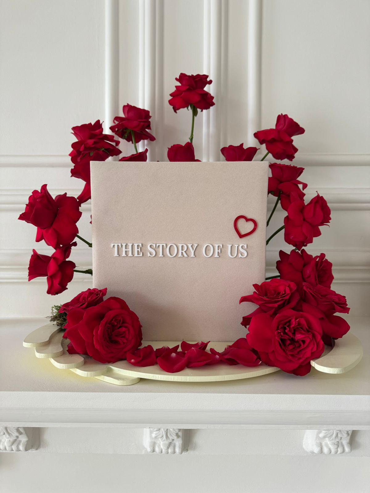 Romantic red roses arrangement , paired with a photo album creating a meaningful and timeless keepsake.